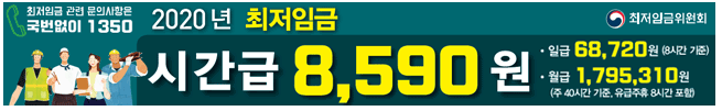 먼저, 2020 최저임금 최저시급은 8,590원입니다. 월환산액은 1,795,310원입니다. 월 환산액 계산법은 8,590원 × 209시간입니다.