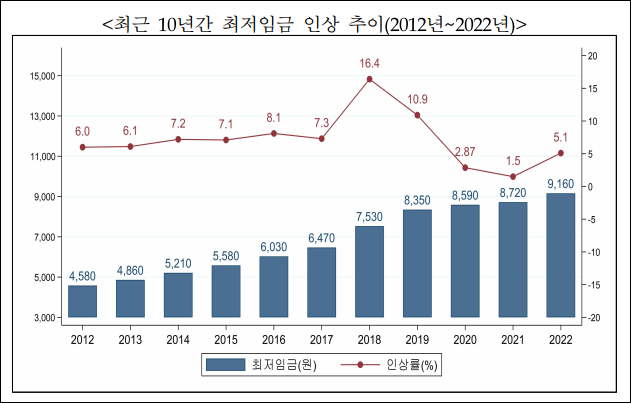 최근 10년간 최저임금 인상추이와 함께 2022년 최저임금을 비교해 보시기 바랍니다.
