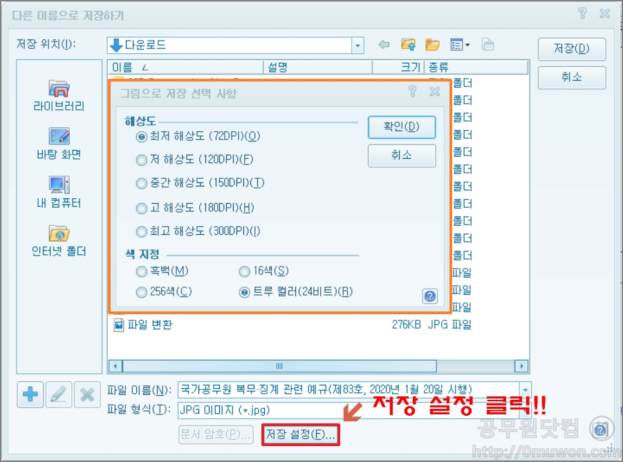 파일 형식을 변경 후에 "저장 설정" 버튼을 클릭합니다. 여기에서 이미지 파일의 해상도 및 색 지정 설정을 할 수가 있습니다. 해상도는 5가지로 설정이 가능합니다. 최저 해상도, 저 해상도, 중간 해상도, 고 해상도, 최고 해상도가 있습니다. 카톡으로 보낼 때는 최저 해상도로 설정해도 상관은 없습니다.