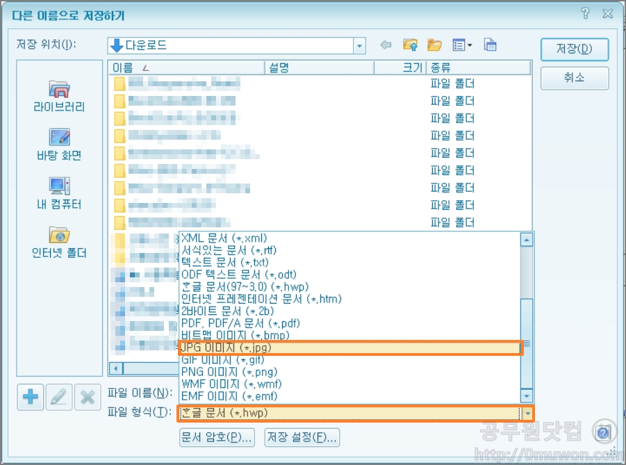 다른 이름으로 저장하기 창이 나타나면 파일형식을 한글문서(*.hwp)에서 JPG이미지(*.jpg)로 변경을 합니다. ODT문서나 PDF 등으로도 변경이 가능합니다. 다양한 형식으로 파일을 저장할 수 있습니다.