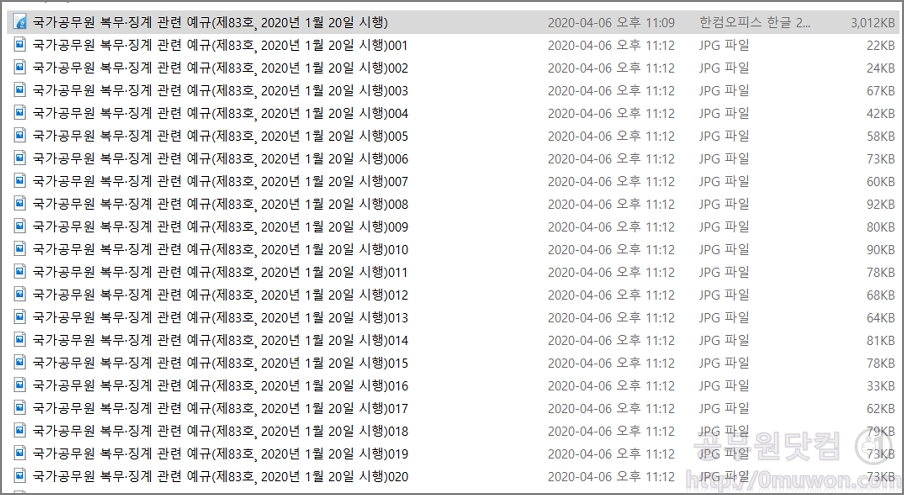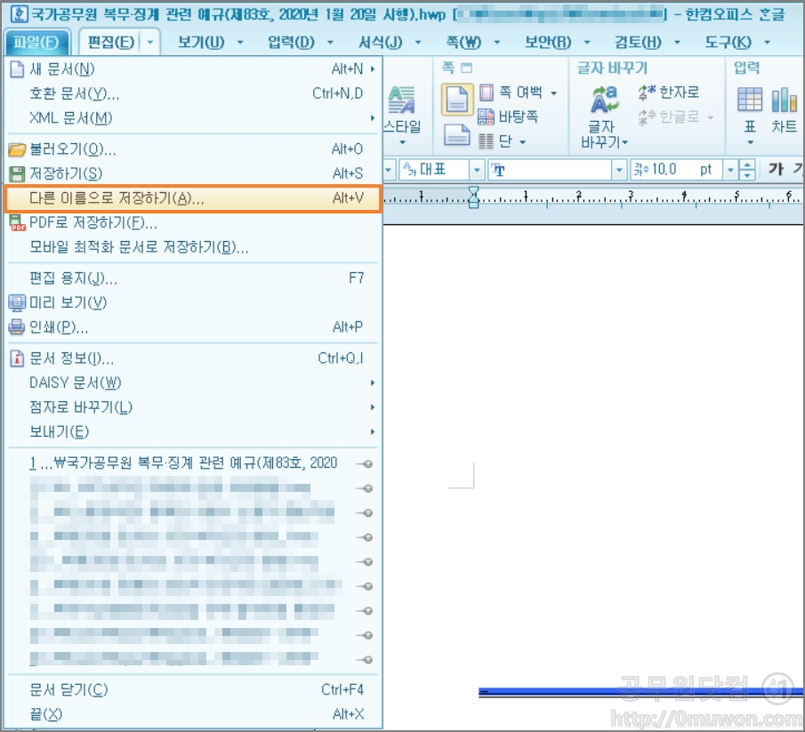 이미지로 변경할 한글문서를 불러옵니다. "파일 > 다른 이름으로 저장하기" 를 클릭합니다. 국가공무원 복무 징계 관련 예규 파일을 이미지로 변경해보도록 하겠습니다.