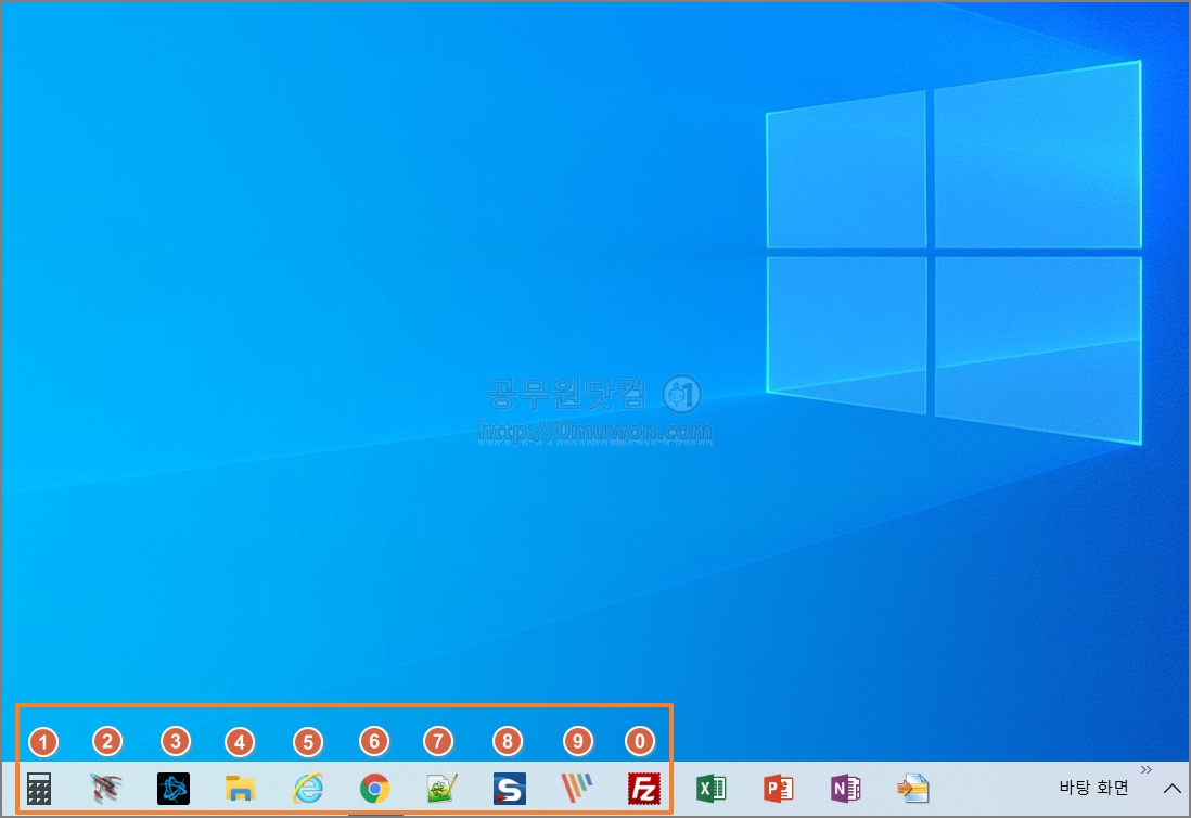 "윈도우키 + 1" 을 누르면 첫번째에 있는 프로그램이, "윈도우키 + 2"를 누르면 두번째에 있는 프로그램이 실행됩니다. 0부터 9까지 10개 까지 지정이 가능합니다.